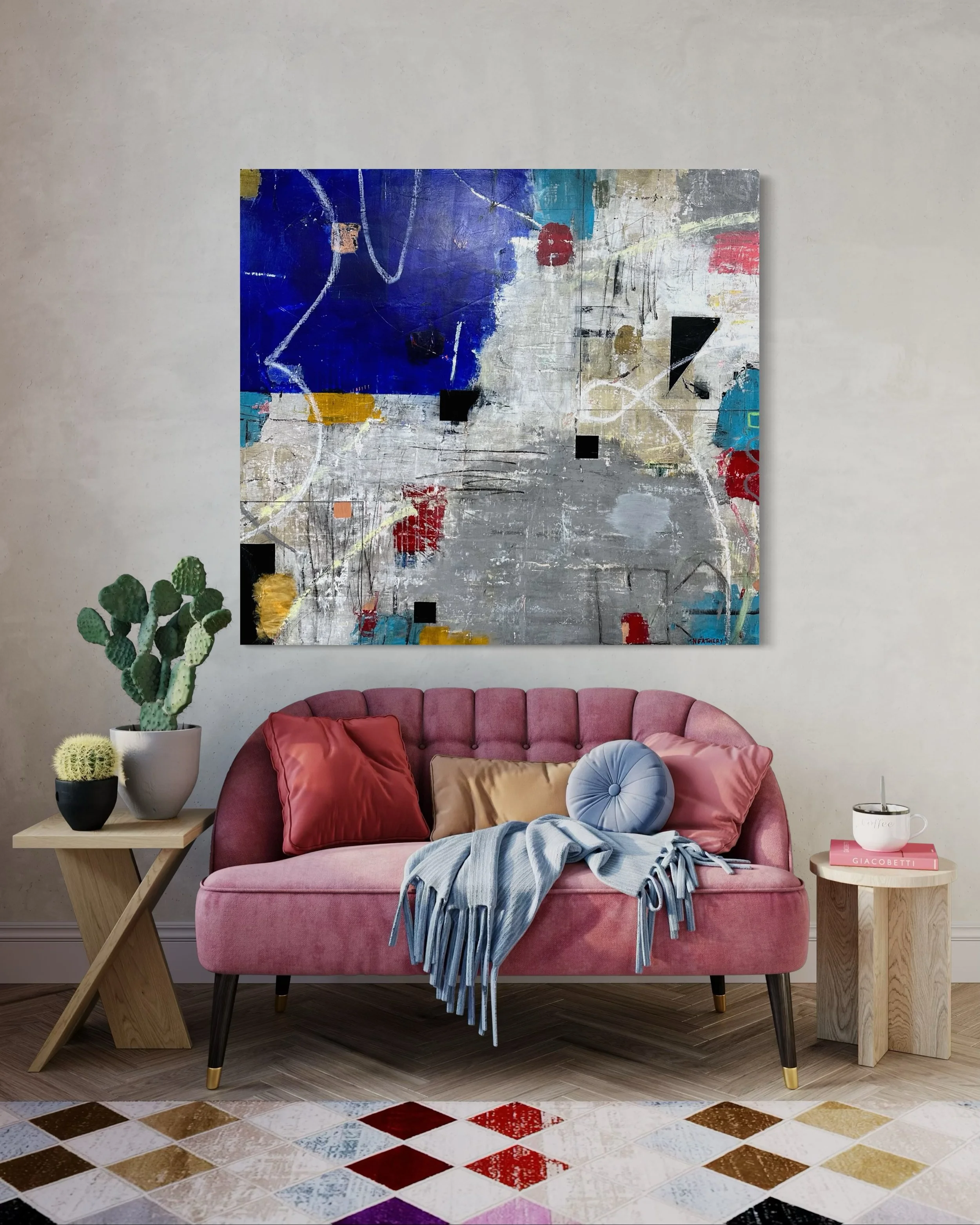 “I paint abstractly, influenced by the raw energy of Jackson Pollock, the thoughtful restraint of Robert Motherwell, the bold gesture of Willem de Kooning, and the quiet spiritual abstraction found in the work of Georgia O’Keeffe. Geometry, symbols, and layered shapes appear consistently in my work—not just for visual interest but to create a kind of visual rhythm, like music unfolding on canvas.”