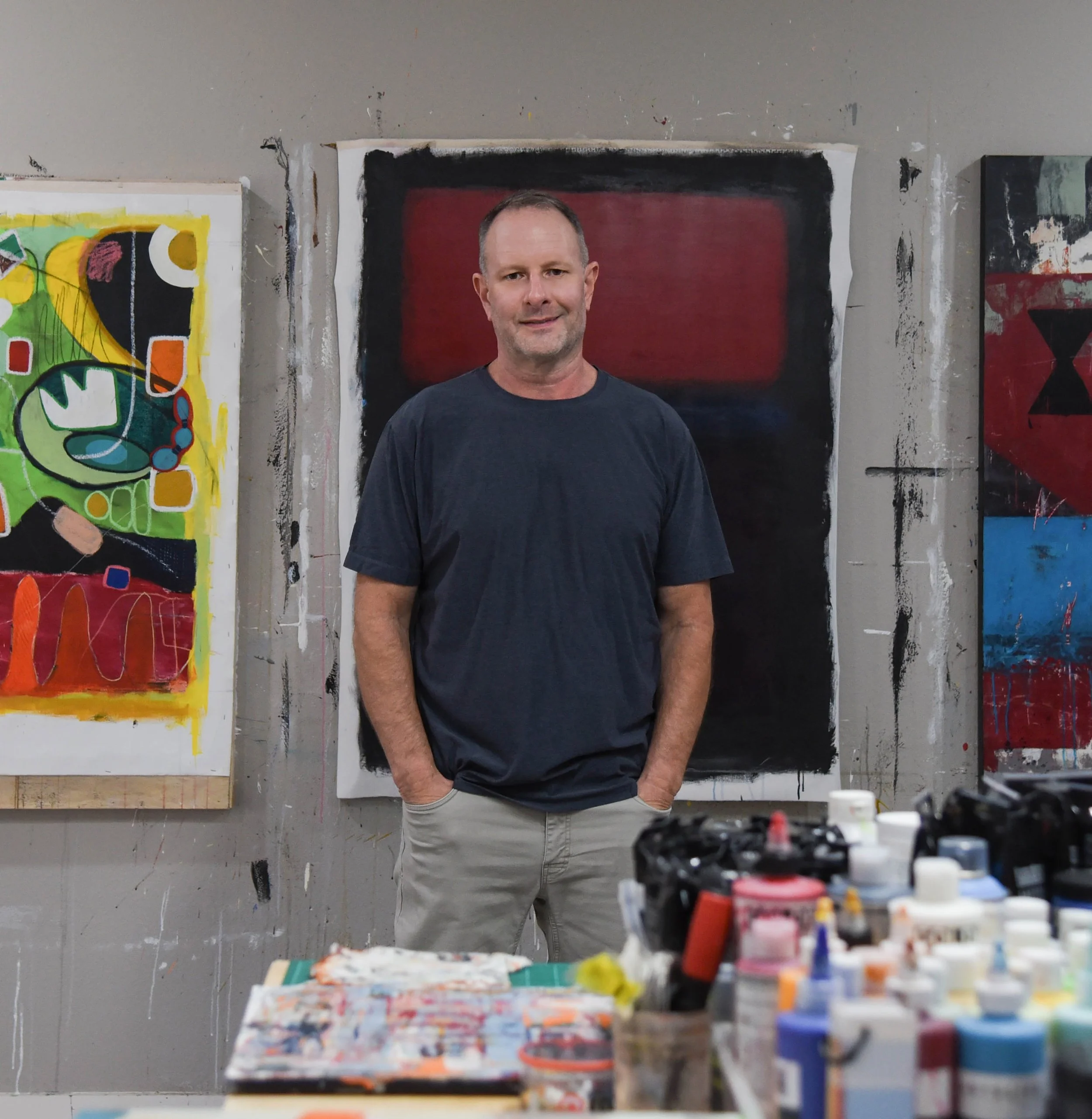 I paint abstractly, influenced by the raw energy of Jackson Pollock, the thoughtful restraint of Robert Motherwell, the bold gesture of Willem de Kooning, and the quiet spiritual abstraction found in the work of Georgia O’Keeffe. Geometry, symbols, and layered shapes appear consistently in my work—not just for visual interest but to create a kind of visual rhythm, like music unfolding on canvas. My palette is deeply informed by the desert Southwest, a nod to my early influences and to my mother, who painted Western themes as a novice painter.